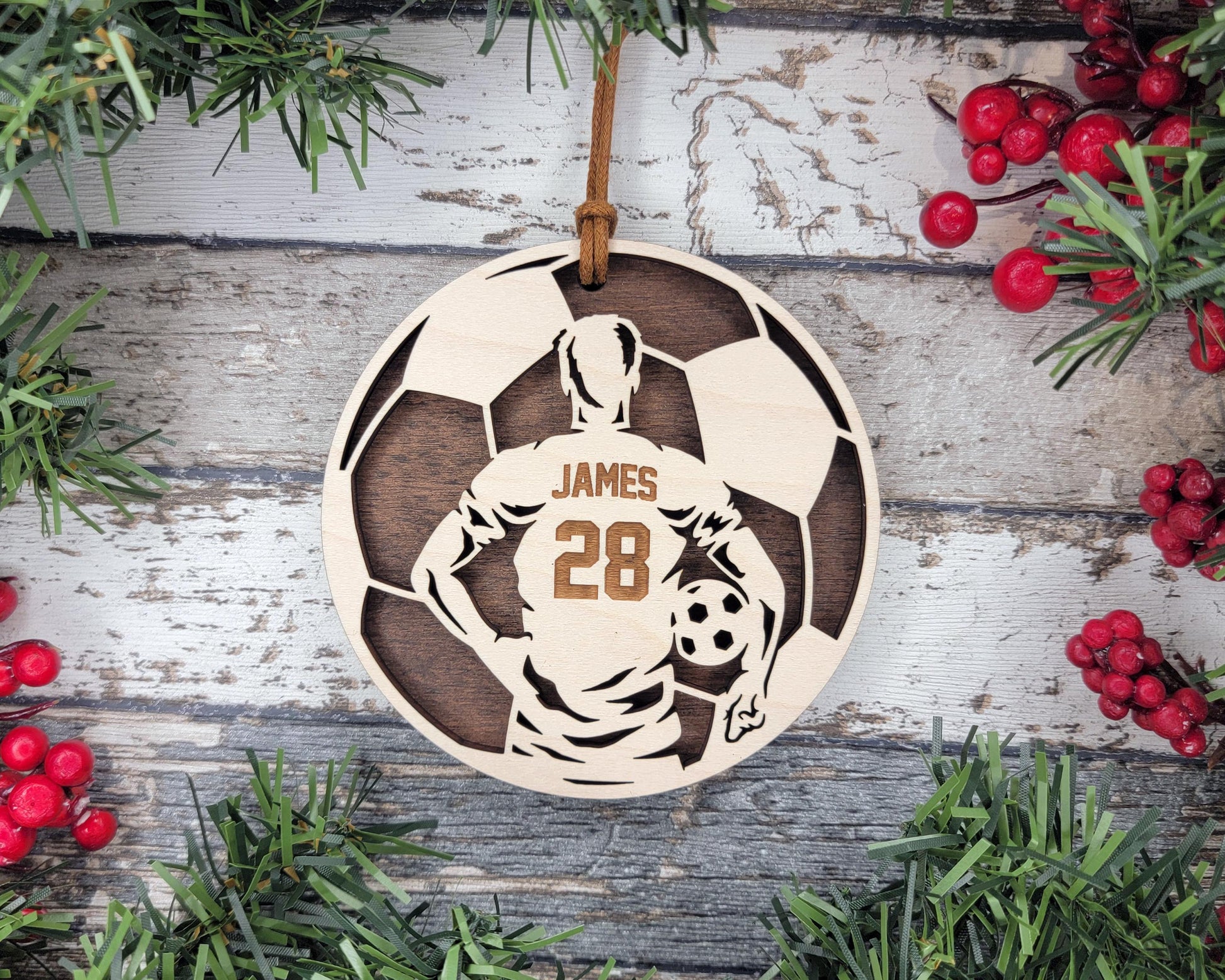 by a classic soccer ball shape. Personalize the ornament with your name and jersey number to celebrate your